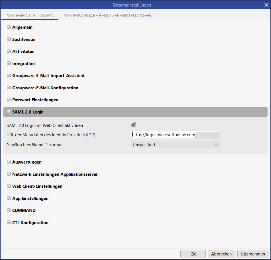 Now the mask for configuring the SAML details opens. Here the "App Federation Metadata Url" can be viewed and copied. This value must then be entered in the system settings of the CRM system in the "SAML 2.0 Login" area in the "URL of the Identity Provider (IDP) metadata" field.