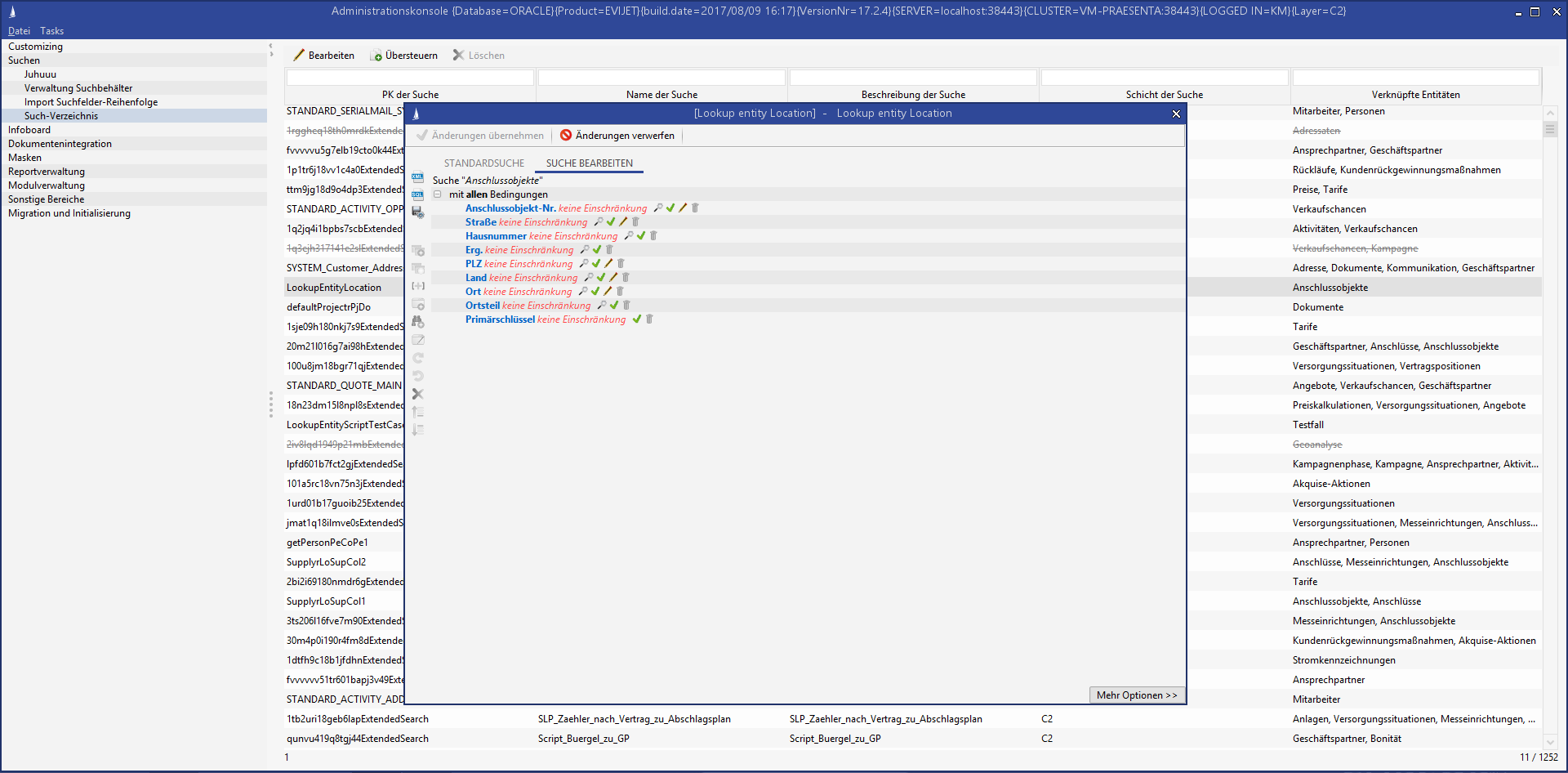 The Search Directory node in the administration console provides an overview of all searches in the CRM system. If you select this item, a list of existing searches is displayed in table form. The table is divided into the columns