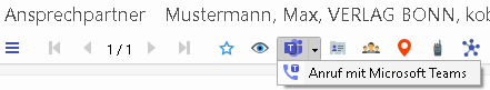 Activate MS Teams integration | Activated Connection of MS Teams as telephone system. The callto protocol must be linked to MS Teams in the operating system (e.g. Windows). Via the toolbar to the contact person, business partner, employee, person and communication, the chat of MS Teams can be opened via the associated email address. If the participant does not exist in MS Teams, this will be indicated there. ![]() The call via MS Teams can be initiated via the button in the toolbar or at the email field. ![]() Deactivated |
