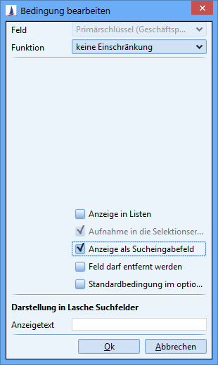 Only the main search, but not any table searches, is displayed on the search screen. The following setting causes a field of the main search to appear on the search mask.