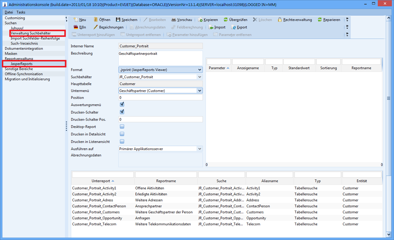 Reports are edited via the Administration Console. It is accessed from CURSOR-CRM/EVI via the menu item Administration / Administration Console.