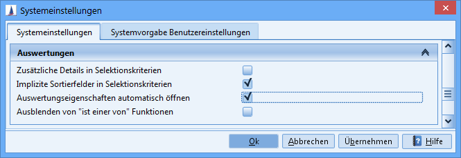 In the Report Properties, the user can influence the display in the report. They are automatically displayed at the Print button and can be viewed in the Reporting menu in the search mask.