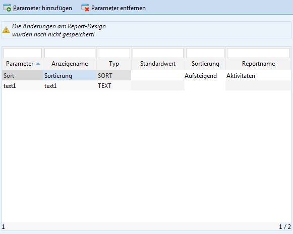 A new parameter can only be added if its name is not yet in use. The name of the parameter is also checked in the report design to avoid conflicts. The new parameter (with the exception of the sort parameters) is inserted in the design of the report and can be used there. It can also be used in the subreport.