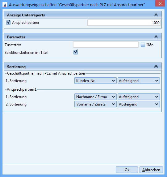 Sort parameters | You can manipulate the sort order in the report or subreport. You can choose from all fields that have not yet been used for sorting. If the report uses implicit sorting, these cannot be changed, but are only listed for the user. The implicit sort parameter, for example, for a grouping in the report, appears before those that the user can change. ![]() |