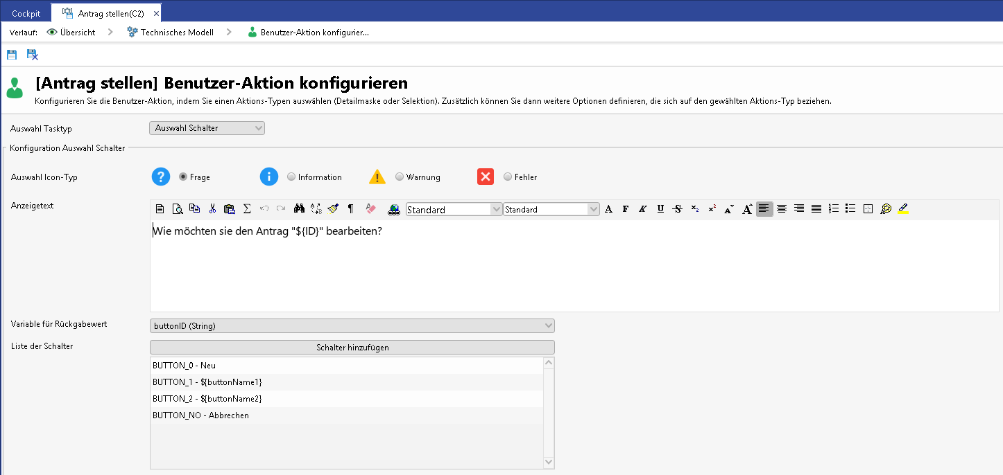 Button configuration - Any number of buttons with unique ID and display name can be added for display. Individual buttons can be removed or changed via the context menu. Process variables with the spelling${variablename}can also be used for the labeling of the switch.