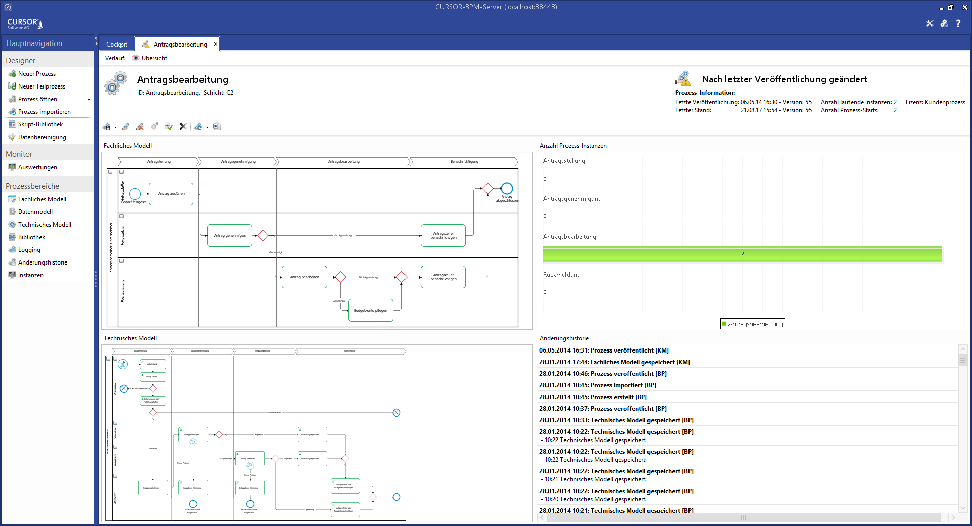 You can create, open and import tasks via the Designer in the main navigation. From there, you reach the process cockpit, where the following information is presented in an overview: