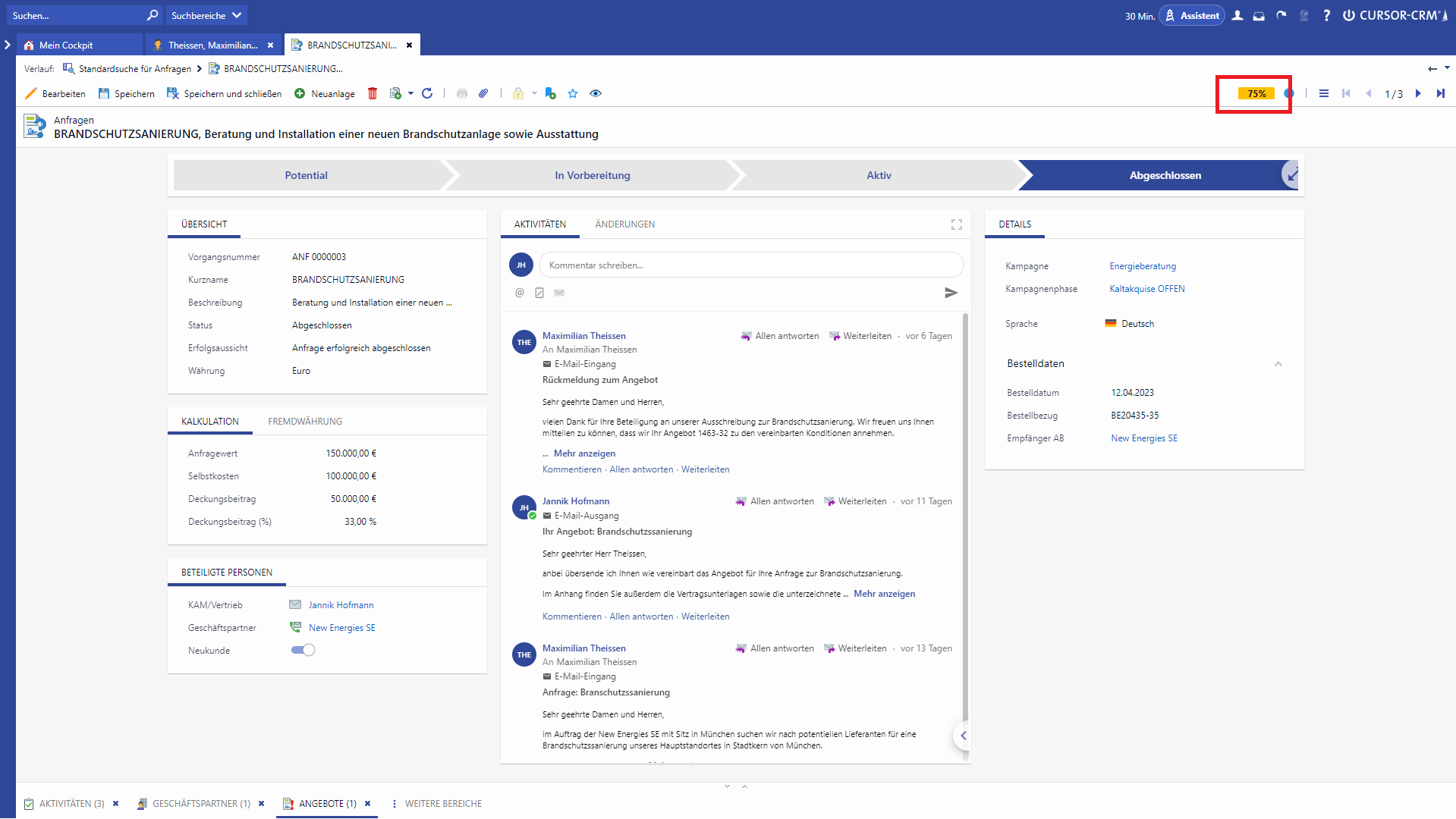 Data quality can thus also be evaluated, e.g. the average data quality of all business partners in a specific customer segment within a KPI tile. For the entities business partner, contact person, requests, quotes, projects, contracts and inbounds, a few default fields were marked as relevant for data quality.