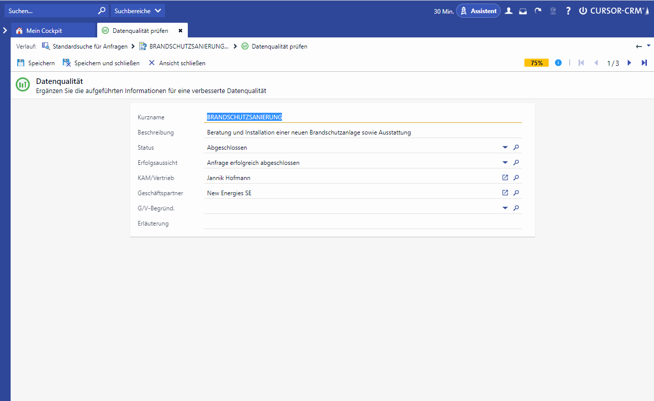 So that it is immediately apparent whether datasets are completely filled with the most important information, each dataset has a quickly visible, visualized score. This shows what percentage of the most important information is filled in the present dataset. If, for example, only 20 percent of the relevant data is available for a dataset, it is immediately obvious that rework is necessary or that missing information should be added.