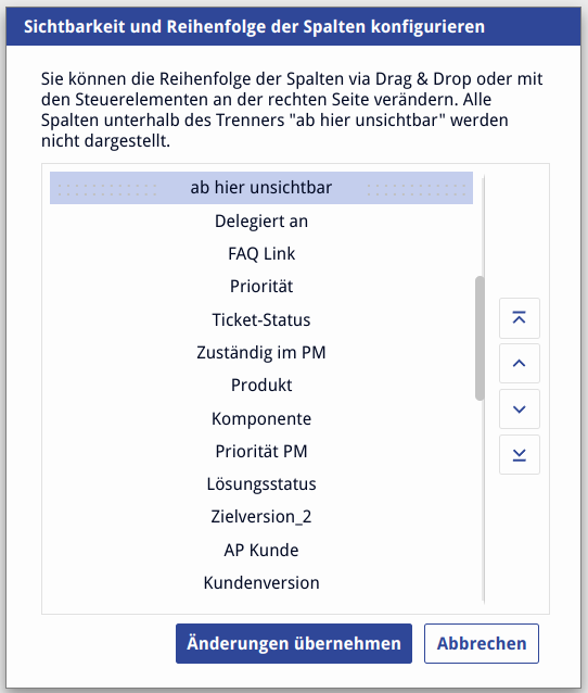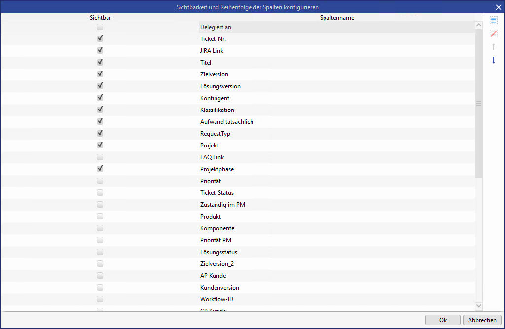 Transfer from column configuration + all additional fields from search of type "Output in search result and lists". The additional fields are output according to their order in the search.