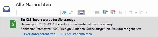 The Excel file was also generated and created as a document dataset in CRM. However, the document will not be opened. Instead, the entry is removed from the task list.