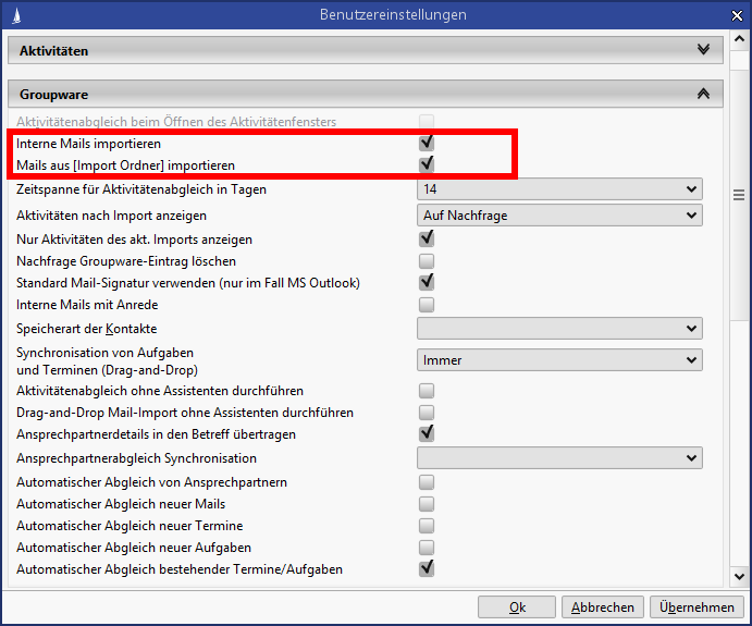 Figure: Configuration for the mail import under User preferences / Groupware