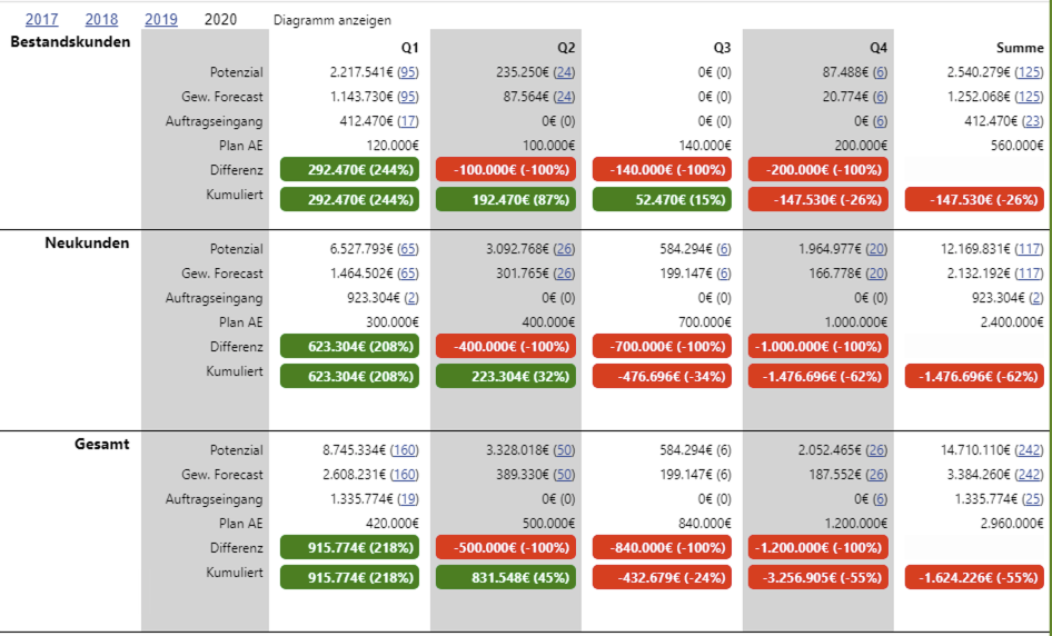 The info tile "Incoming Orders" shows the user the current incoming orders via sales opportunities grouped by quarter and existing or new customers. Hereby the difference to the planned figures is also calculated. Past years can also be considered.