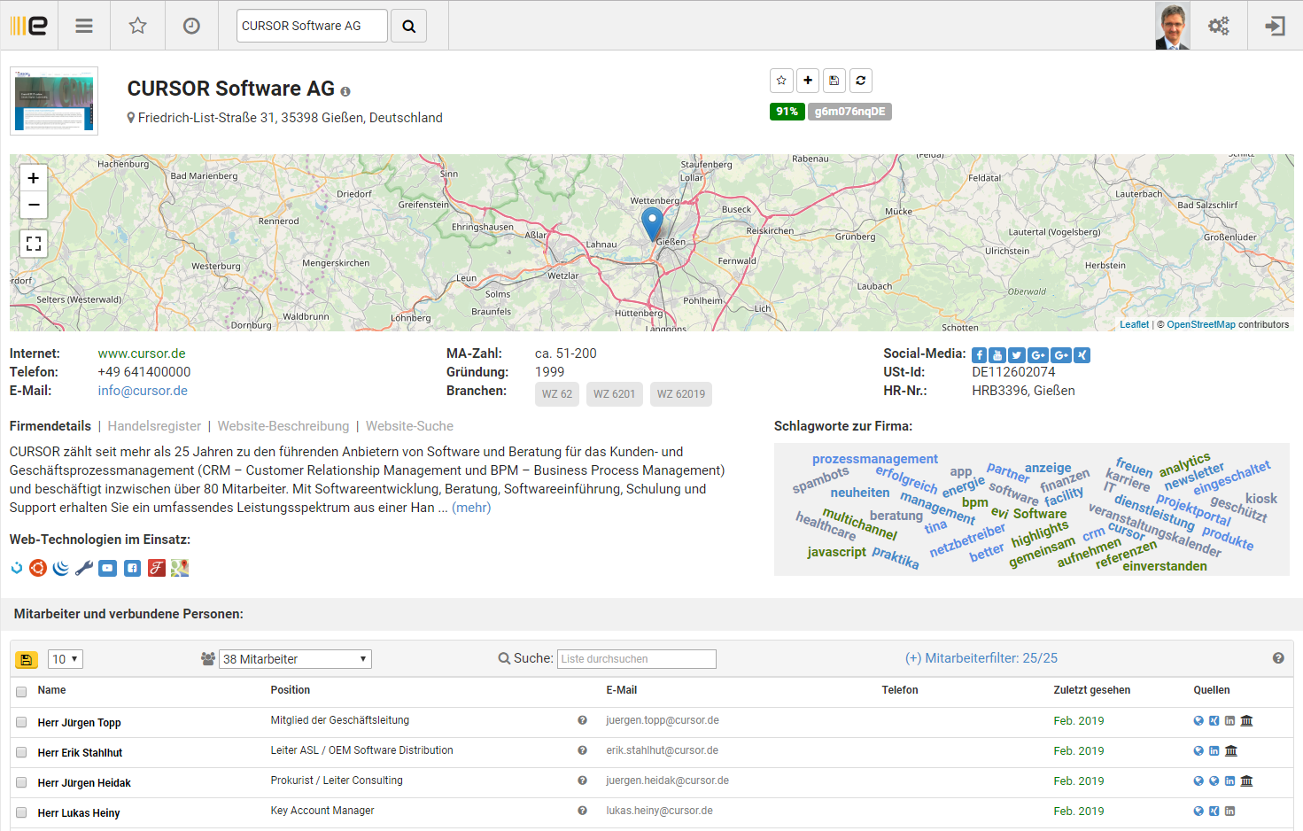 Employee | Activated All employees (contact persons) of the business partner who can be determined from the web and registers are displayed with telephone number, social media, job title/activity in the company and last update date. ![]() |