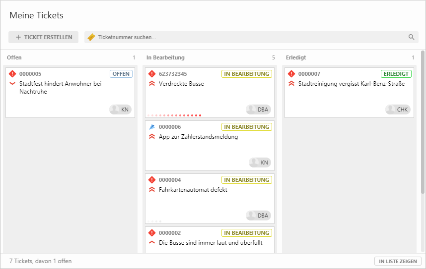 The Kanban board consists of lanes, each of which represents one or more combined ticket statuses. On these lanes there are maps which represent the tickets corresponding to the status. The maps visualize different information for quick acquisition: