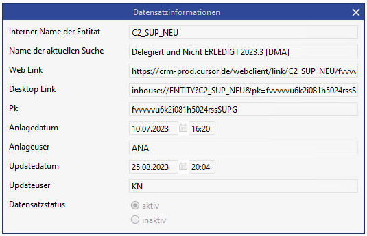 The context information of the current dataset (creation date and user, change date and user, PK, etc.) need not to be placed as fields on the masks, but can be called up via the button in the toolbar