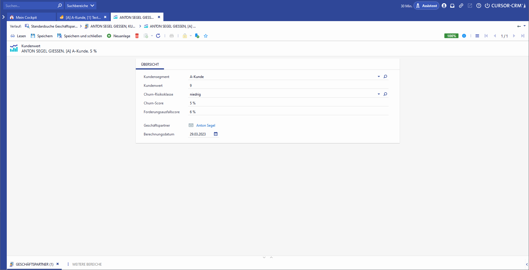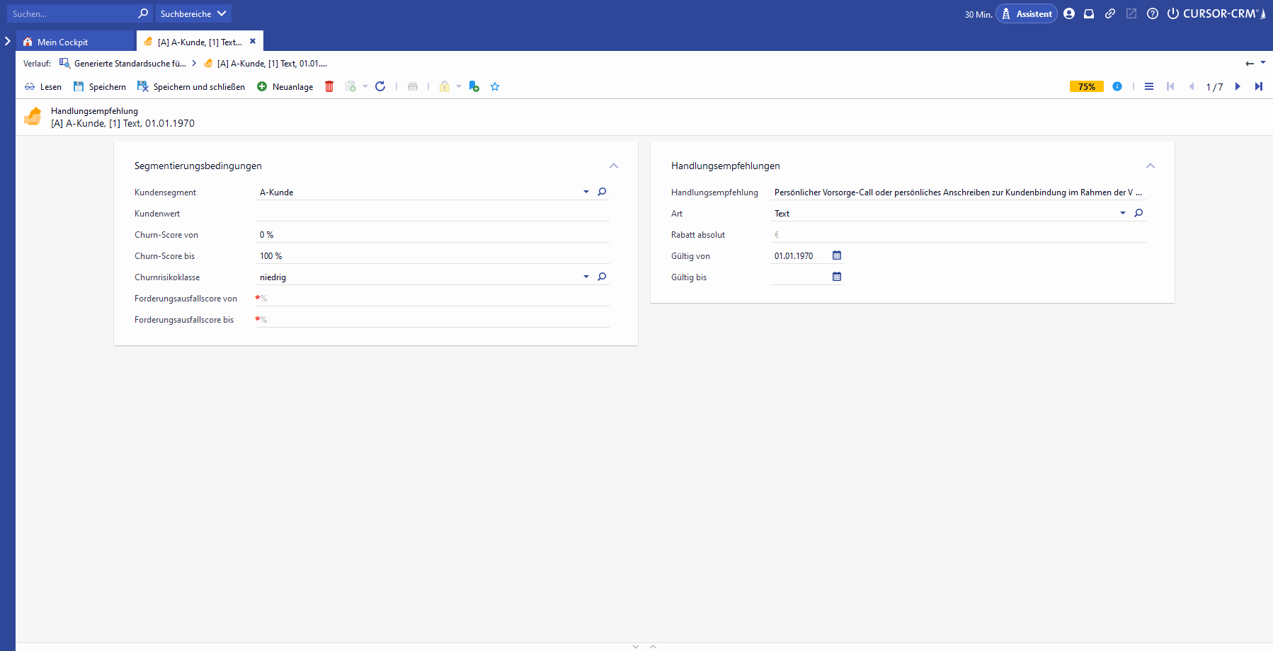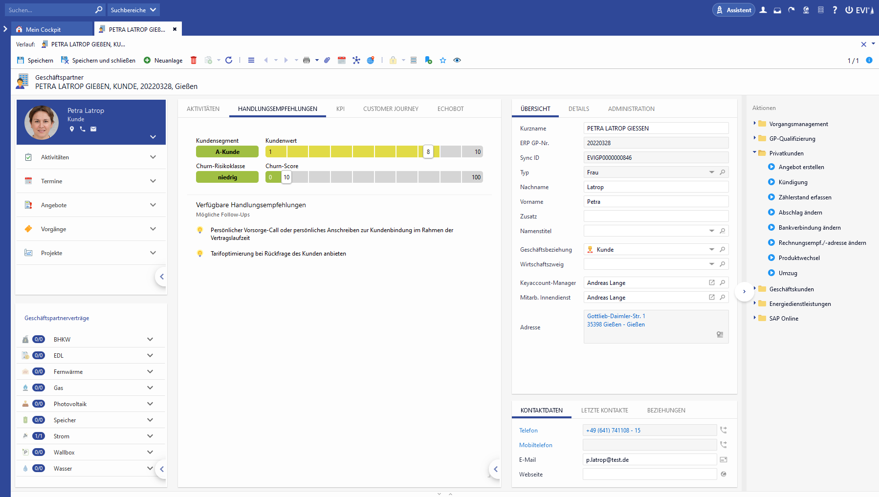 After the module has been activated in the CRM system, a structure is available in the default system that enables the customer segment, customer value, churn risk class and churn score of a business partner to be recorded. By connecting data providers such as Energieforen Leipzig, this information can be filled in the areas created for this purpose through imports and interfaces. The values stored for a business partner can be viewed on an infoboard tile placed on the business partner. Furthermore, it is possible to define corresponding recommendations for action in the system for specific segments, risk classes and customer value areas. If the business partner falls within the criteria defined in the recommendation, these recommendations for action are displayed on the tile and enable the customer service representatives to react adequately to the customer's needs or to initiate appropriate measures if, for example, an immediate loss of a business partner is imminent.