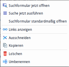 Via the context menu of the active entry (click with the right mouse button) a myCRM bookmark can be deleted, renamed, copied, cut or pasted. In addition, you can directly display a search form of the myCRM search.