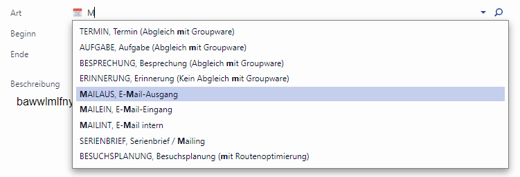 While you enter data in lookup fields or pick list fields, you are presented a list with possible values. This proposal list is determined via system search, whereat results about configurable fields (e.g. shortcut, contact person to business partner or defined filter search per mask script) can be controlled. This function is used in detail view of a dataset and search masks.