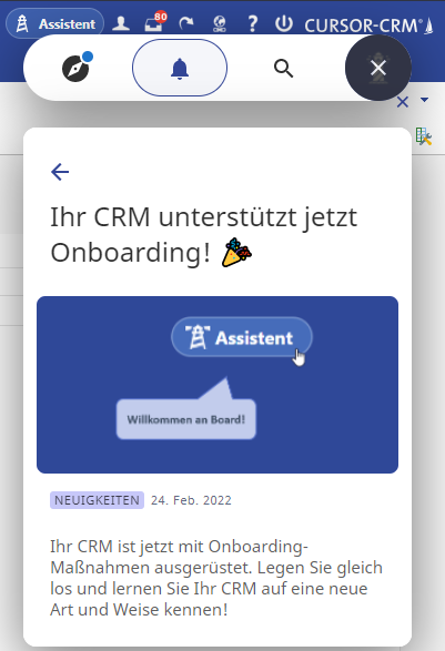 Onboarding Assistant supports you with unobtrusive dialogs. With the help of an interactive product tour, you can be introduced to the system and its functions. Popups alert you to new features and guide you through the application.