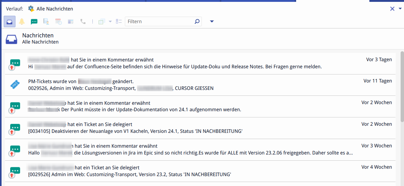 New is the "All messages” button, which opens the complete list again. The multi-select operations in the toolbar are only active if you are on a filtered view (as before in the Web Client). In the view "All messages" the buttons are "disabled". The age of each message is displayed (as is common practice today with notification systems) in the form of time specifications written out in full. Messages are grouped by minutes, hours, days, weeks, months and years. The grouping only changes when multiple messages have been found.