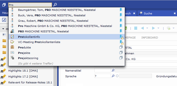 The corresponding entity icon is prepent to the entries in the proposal list. That way the user can see to which data area the respective command leads. At the end another icon is displayed. This one indicates which area (myCRM, search, processes, entity menu, etc.) the list entry comes from. The proposal list is limited to 10 entries, ordered by relevance. Extending the search word the hits can be more limited. If more than ten entries exist, the proposal list shows another "x more entries". Within the hits the entries are sorted according to areas in order to make them easier to find. Duplicates are eliminated from the hit list, e.g. if a bookmark of a dataset exists in myCRM more than once, only one entry of the hit list is displayed. The decision whether a search result is a duplicate, also takes into account if several search criteria are deposited as bookmarks.