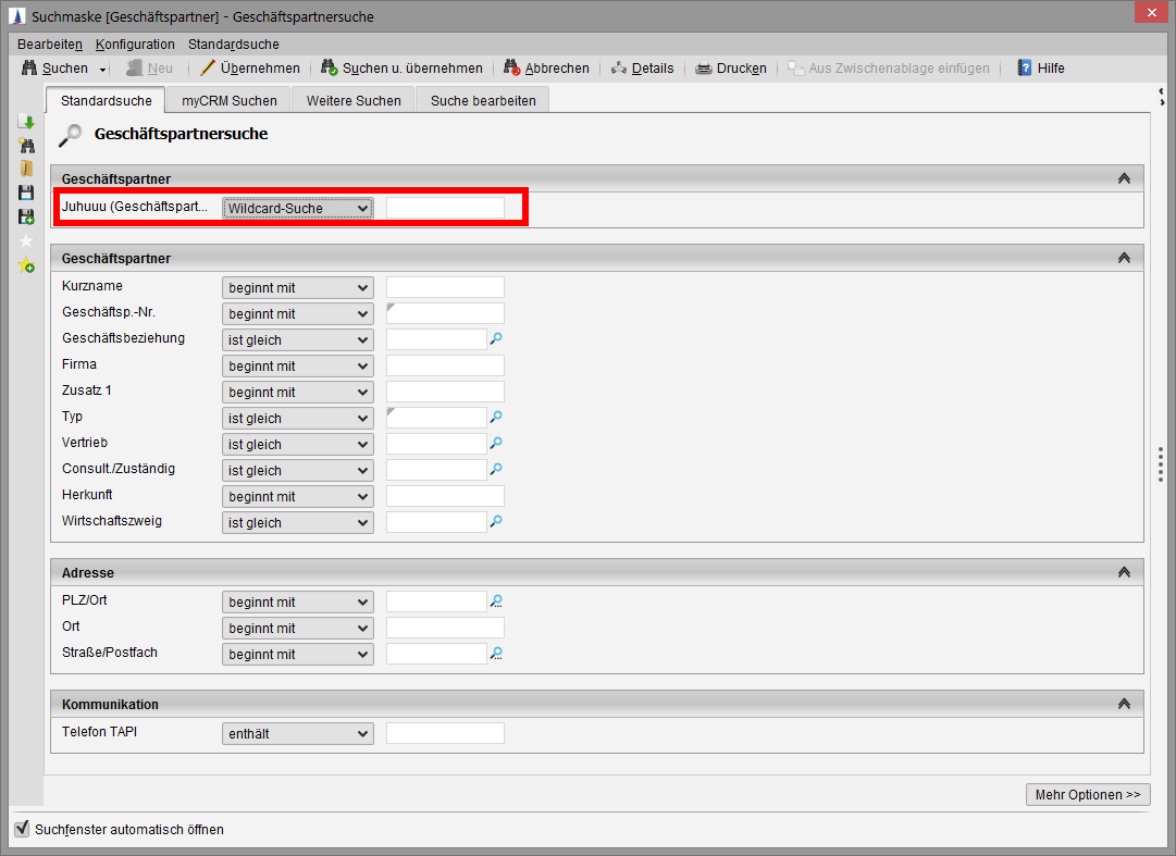 For default, the wildcard search is pre-configured to allow some fuzziness for the readouts. (Note: Fuzzy Search) If the wildcard search has been selected, you anyhow should not use wildcard characters. The search has been pre-configured to skip ("escape") them. Example from practice: a search query | gmbh | provides among others Gebrüder Breitung GmbH and Anton Schneidermeister GmbH & Co. The wildcard characters in the search query | *gmbh* | are unnecessary.