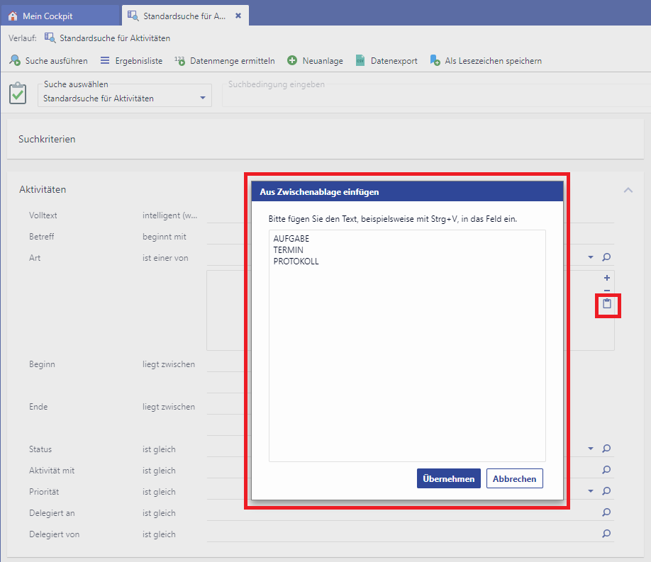 Several entries in the clipboard can be inserted in the case of the search operator "is one of" via an action. For lookup fields, invalid values are filtered out with a hint message like the attempt to insert alphanumeric values into numerical fields. The fields have been extended by a button that opens the input popup. In this popup, the values can be entered. Each line corresponds to a value. Blank lines are allowed. Depending on the field type, the values entered are validated. Values that could not be transferred are displayed in a notification.