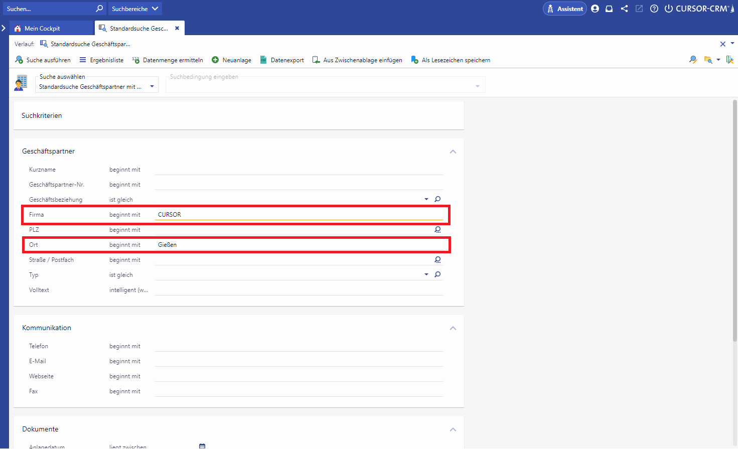 The search conditions Cursor and Gießen are divided into the fields Company and City.