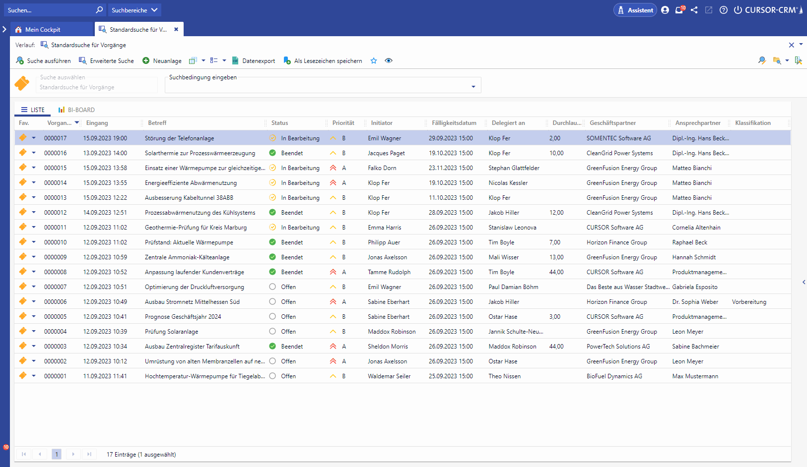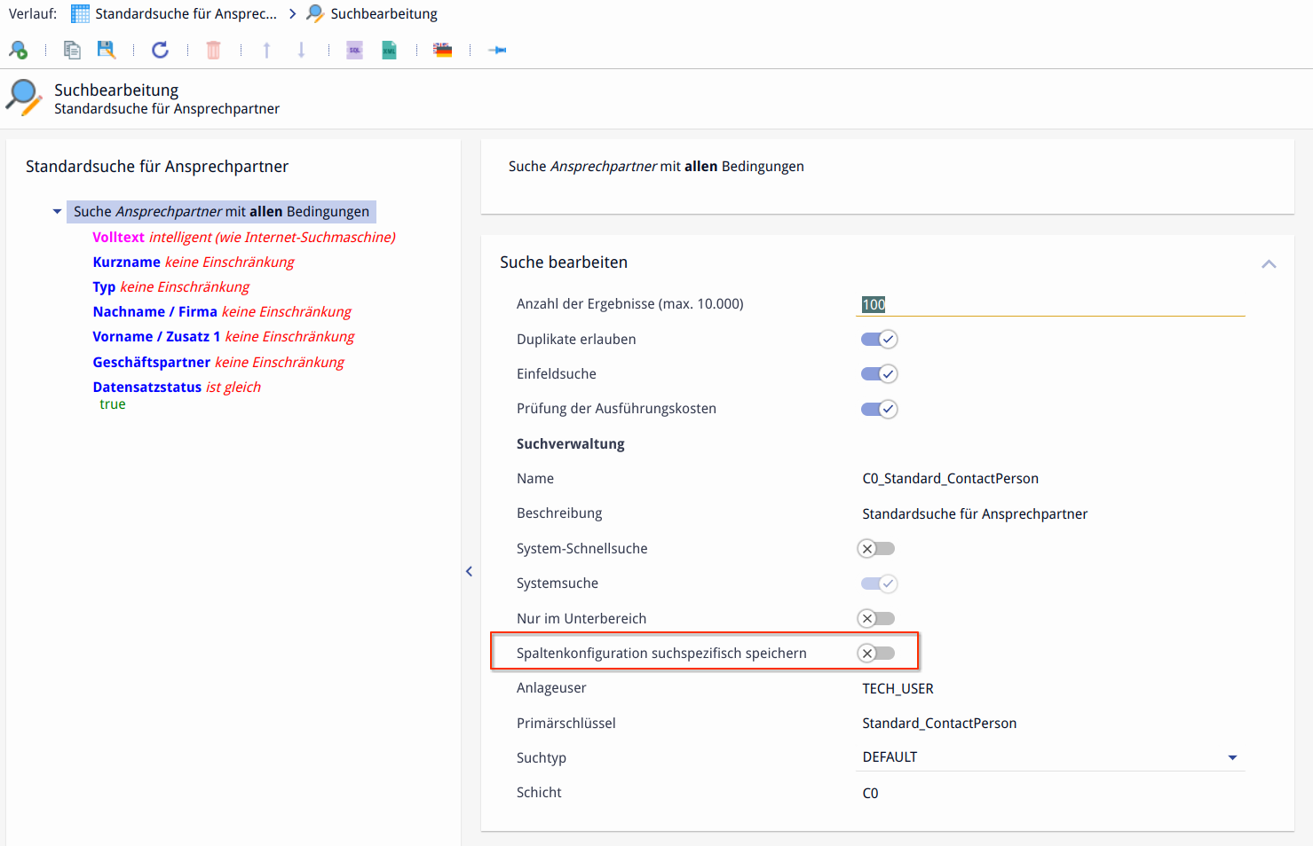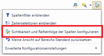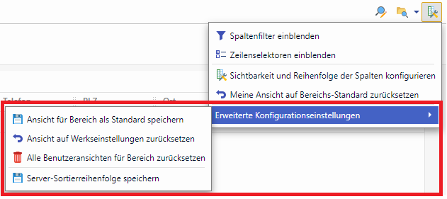 If a user opens a search in an area without a search-specific configuration of the columns, the column configuration of the respective area is used. For example, if a user hides a column in the standard search of the area (e.g. customer number), this column is also hidden in other searches as long as no search-specific column configuration (see below) has been set up there.
