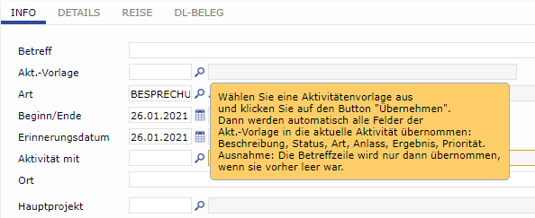 The tooltip mode helps you to operate the program. Move the mouse over the desired mask object (label, input field or button). If a description for the object is available, it is displayed. By default, tooltip mode is enabled.