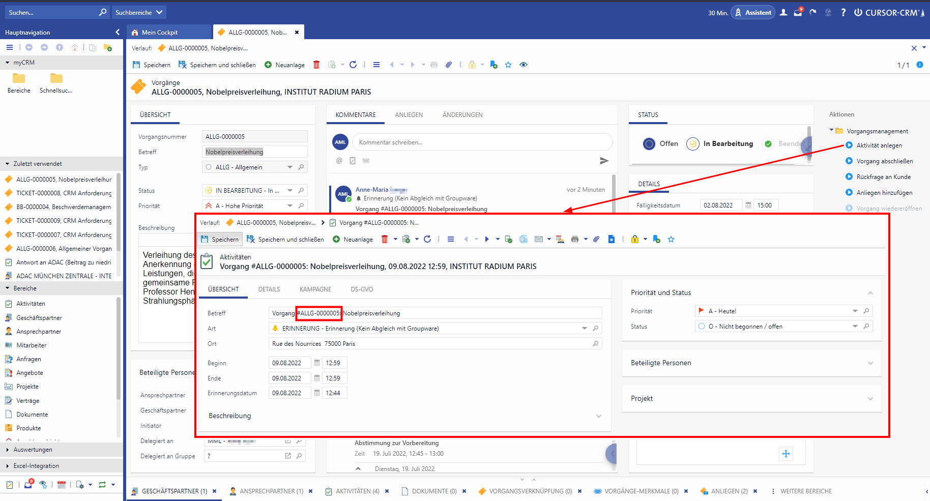 If there is a saved ticket, communication with the customer can take place. In addition, more information about activities can be added in the activity box Create activity. An activity with default values or text opens.