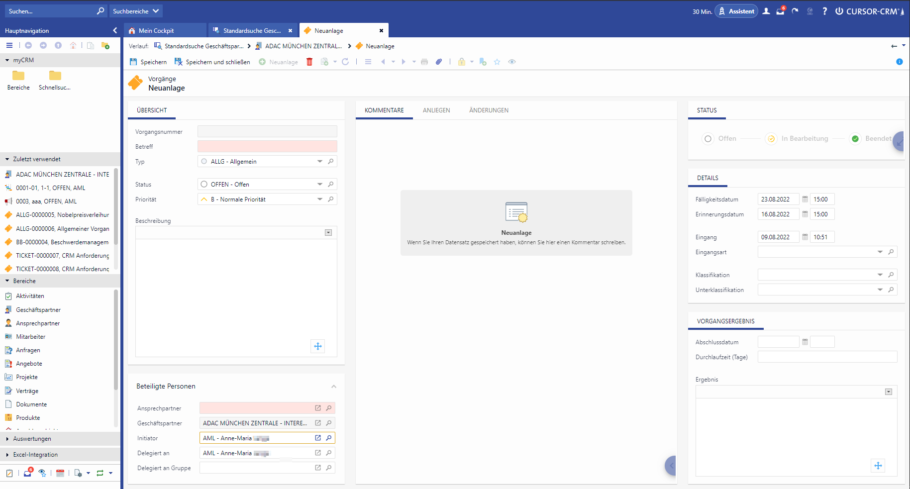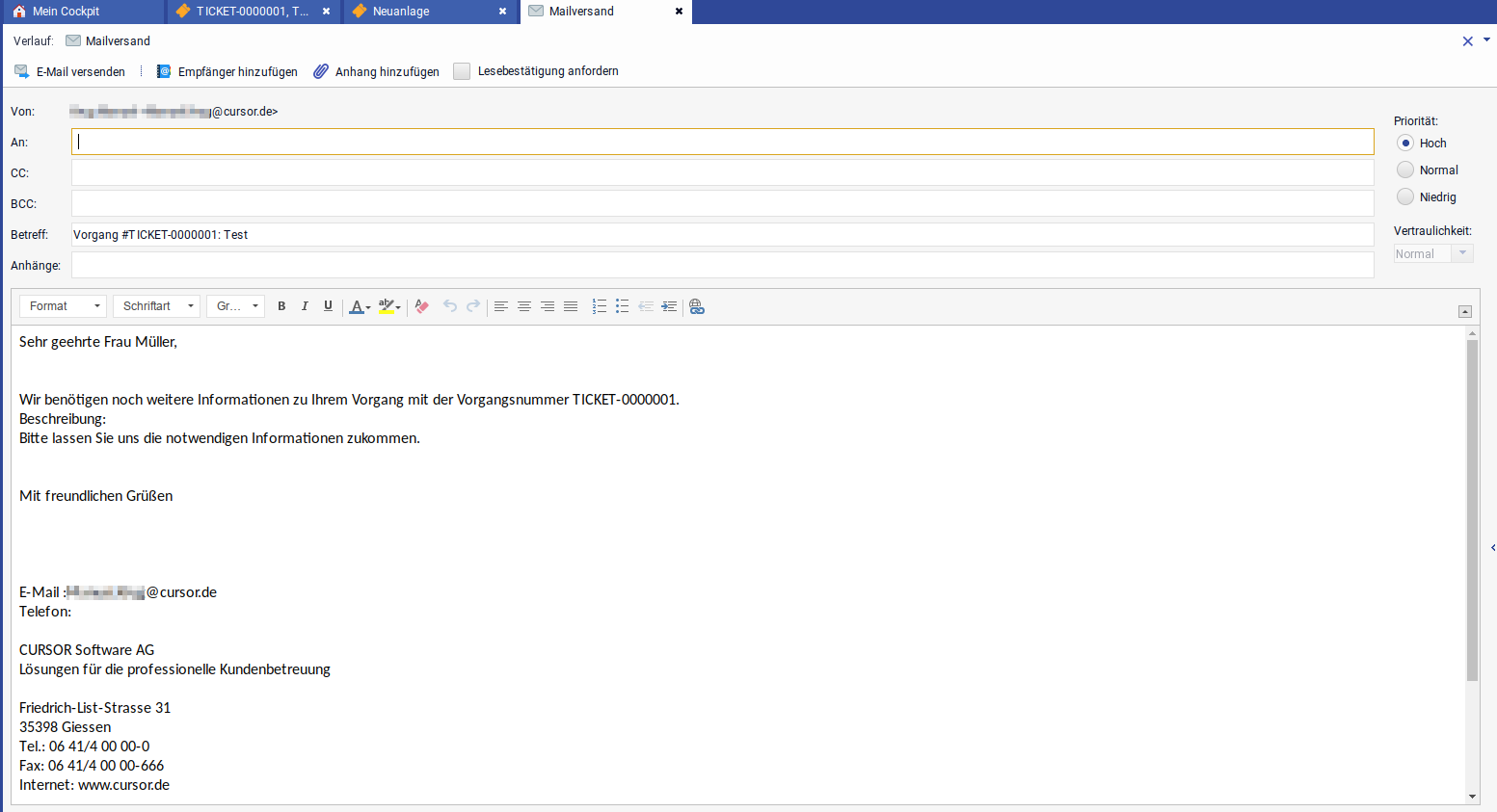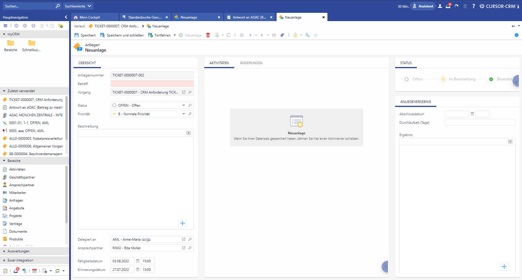 Numerous processes can be mapped with the CURSOR ticket management module. The best examples are clarification of commercial or technical questions, elimination of faults or processing of complaints. Numerous functions for delegation, escalation and documentation allow prompt processing of service requests, concerns and enable simple communication with all parties involved. The communication is represented by tickets, which can be named as desired depending on the process flow (e.g. "complaint" or "request”). A ticket can optionally cover several requests.