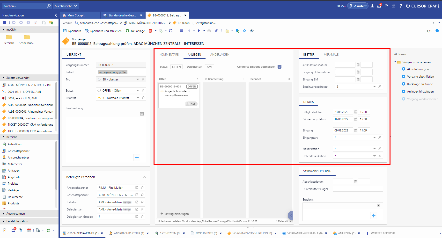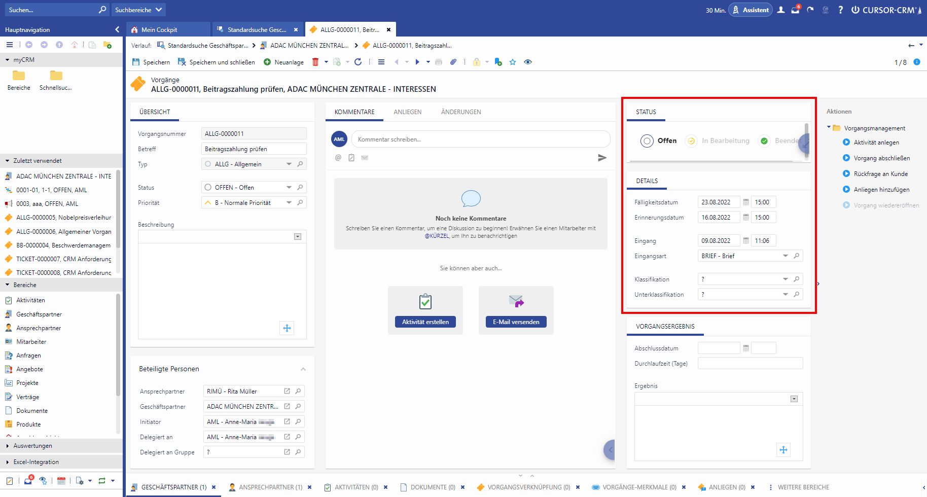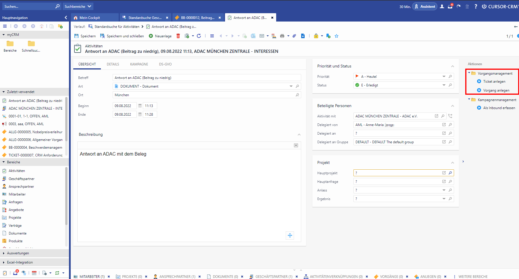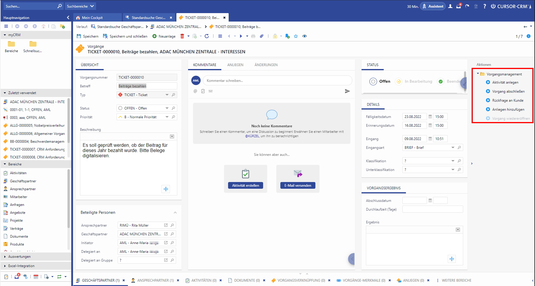 A mapping of several requests to one ticket is possible via the action box. A progress bar and the activity log provide an overview of the current status of the ticket at all times.