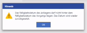 If by a manual change the due date of the request is behind the due date of the ticket, the manual change and saving should be prevented. Instead, the last valid value for the due date of the request is used → Reset to last value