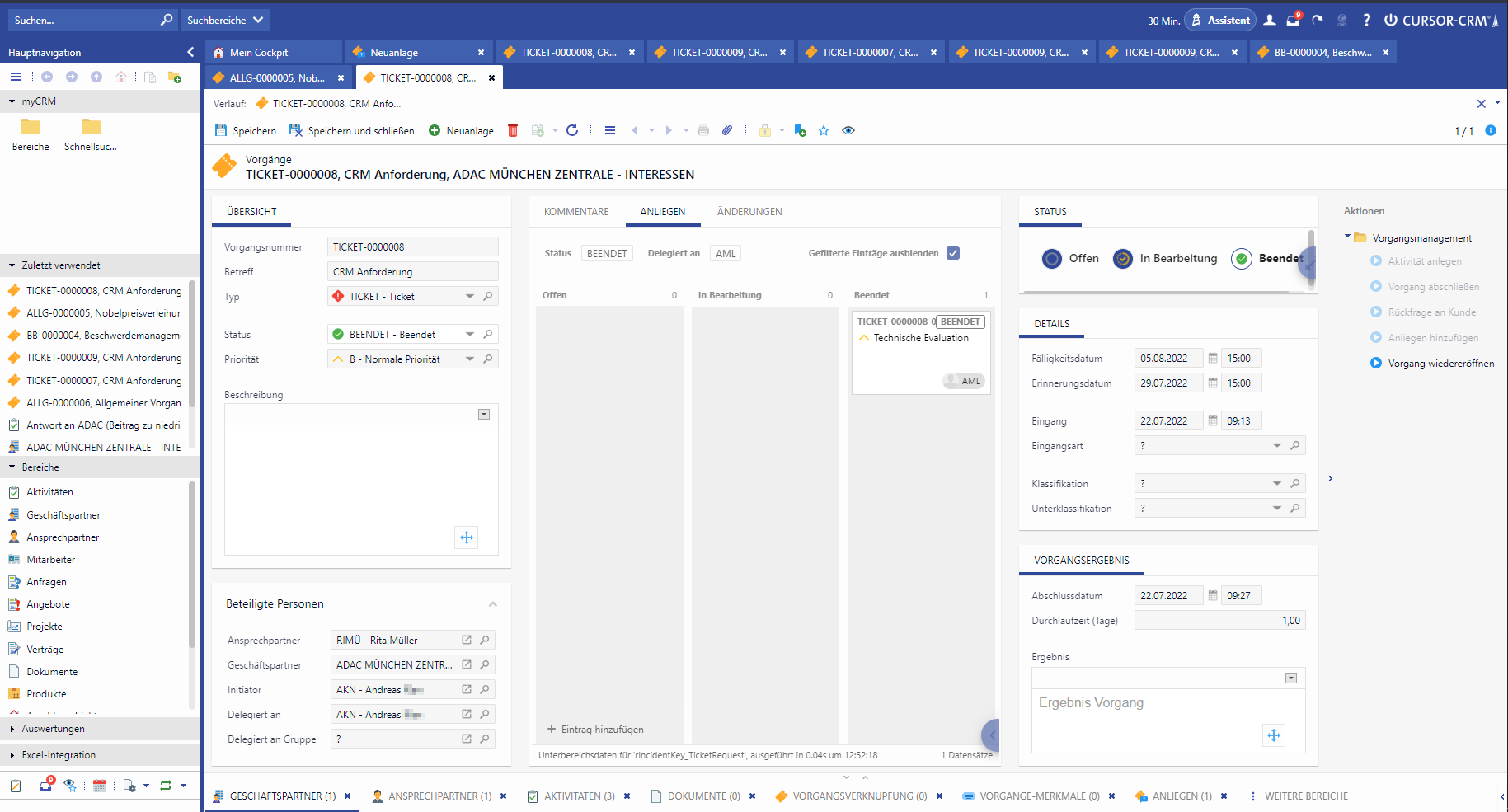 Here you jump directly to the unfinished requests to close them. Sequentially, request and ticket are then documented and closed in the Result field.
